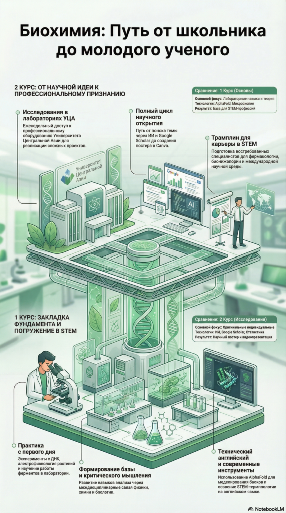 • Уникальная база: Студенты работают с современным лабораторным оборудованием, а учащиеся старшего возраста имеют эксклюзивную возможность заниматься в профессиональной лаборатории Университета Центральной Азии.