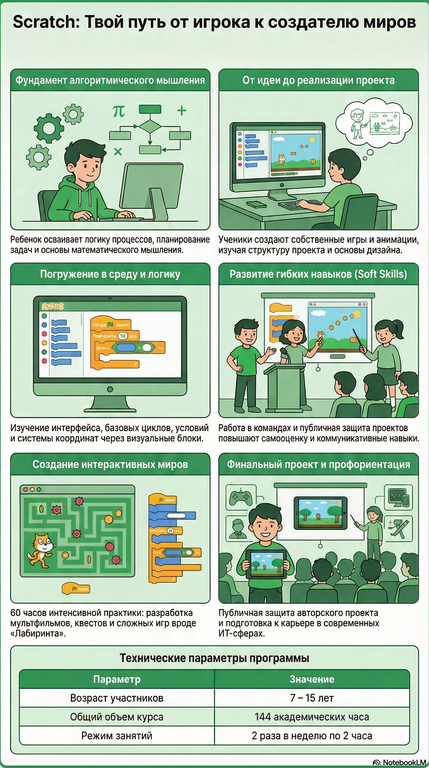 Ваш ребенок проводит много времени за компьютером? Пора превратить это увлечение в мощный инструмент для будущего! Кружок «Визуальное программирование на Scratch» (для детей 7–15 лет) — это не просто кружок, а полноценная инвестиция в развитие личности.
